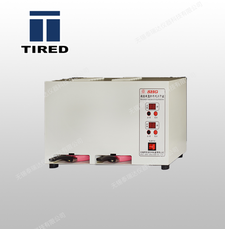 微控雙盤紅外烘干器:本烘干器為測定砂樣(原秒、型秒和芯砂)含水量時供快速烘干之用。系利用紅外線燈泡幅射熱能,使砂樣中水份迅速揮發,再用天平稱量,計算砂樣所含水份。其結構主要由外殼、紅外線燈泡、定時器、開關、指示燈等部份組成。